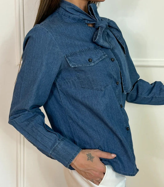 CAMICIA SUSY MIX CHAMBRAY CON FIOCCO E RICAMO MICRO POIS
