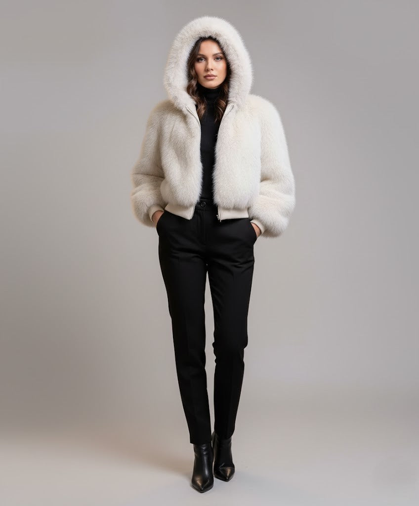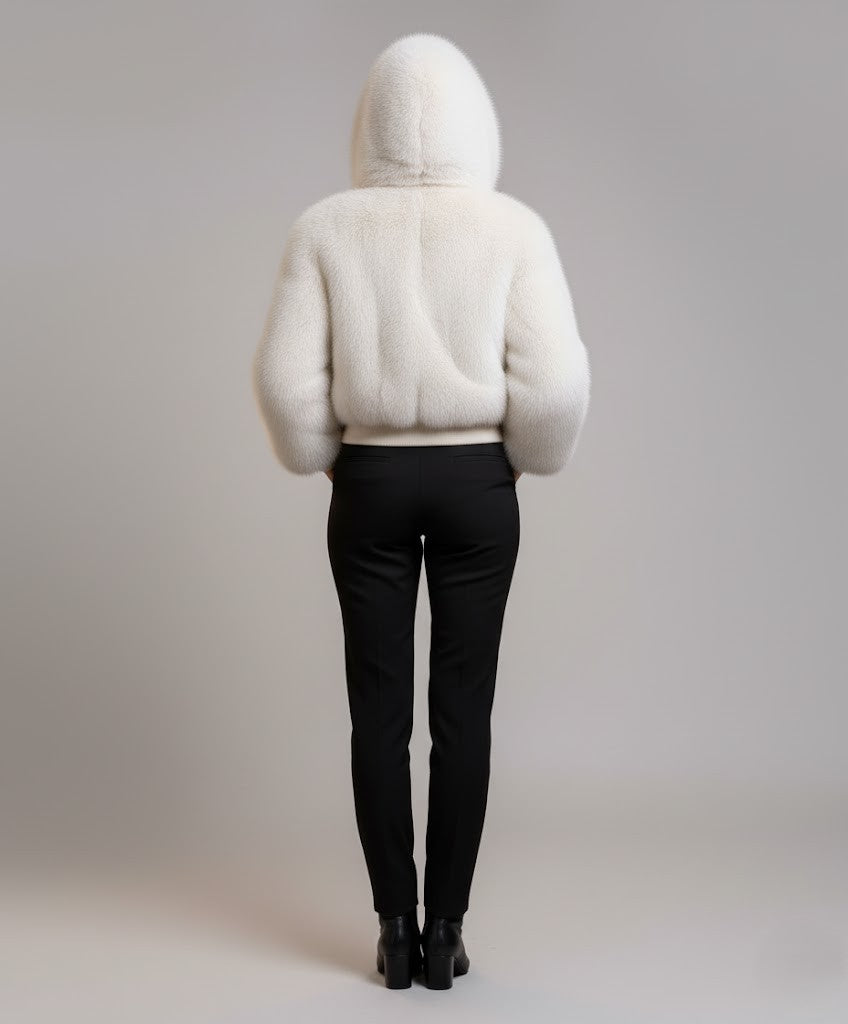 Ecopelliccia corta manica a pallocino con zip centrale, elastico in vita e sui polsini. con cappuccio. tessuto elasticizzato, vestibilità regolare.