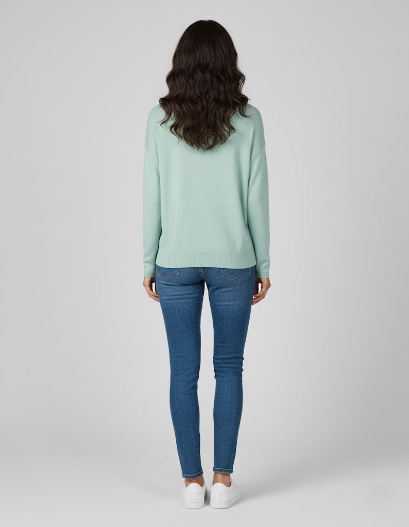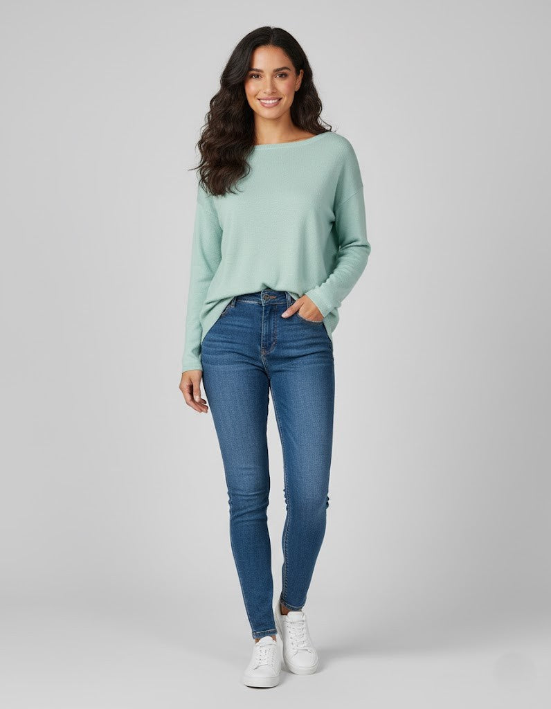 Maglia over in viscosa, scollo a barchetta, manica lunga, tessuto elasticizzato.
