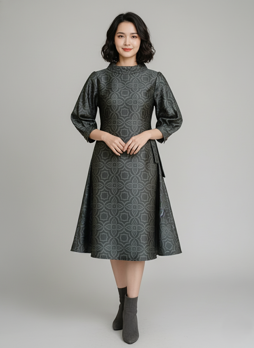 Raffinato e originale, questo abito in tessuto jaquard presenta un'elegante fantasia geometrica nei toni del verde. il modello è caratterizzato da una linea morbida e scivolata, maniche a 3/4 e colletto ampio che dona un tocco di personalità al capo. i lacci laterali permettono di regolare la vestibilità, sottolineando delicatamente il punto vita.