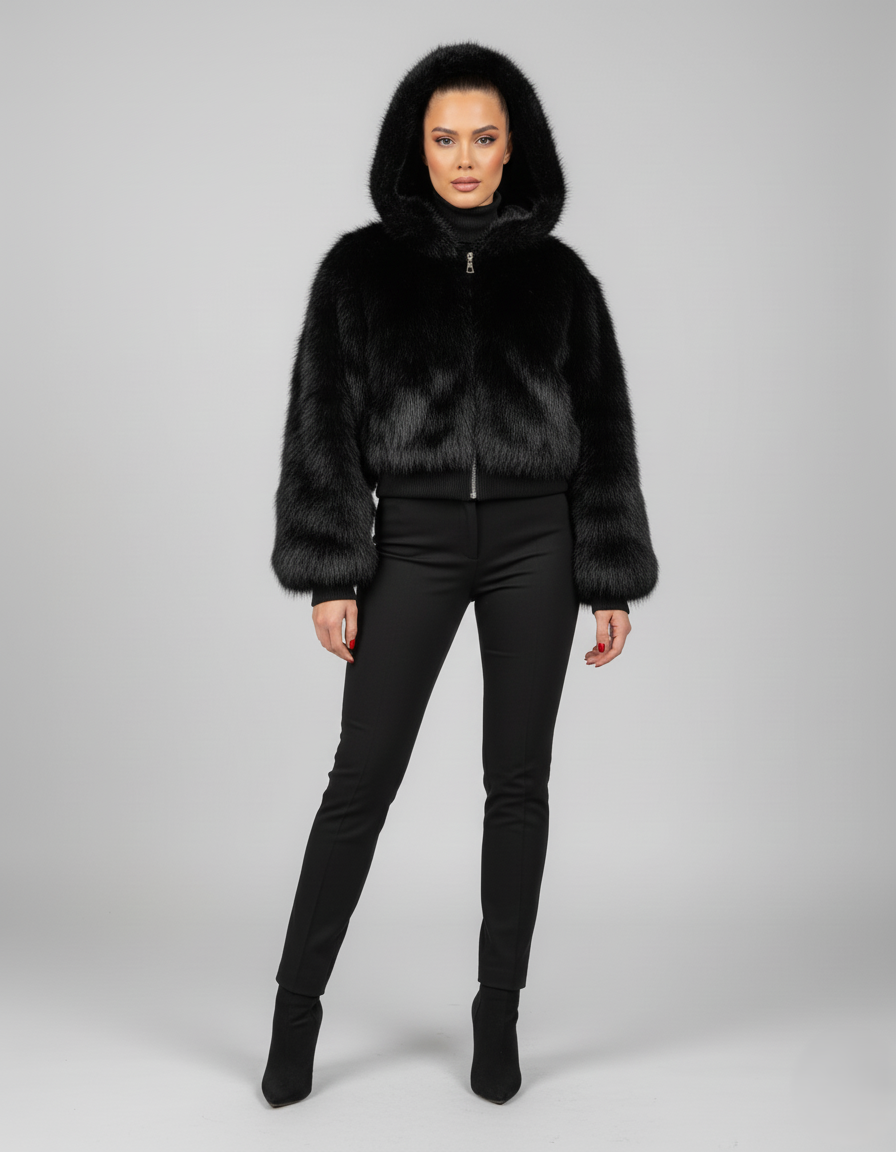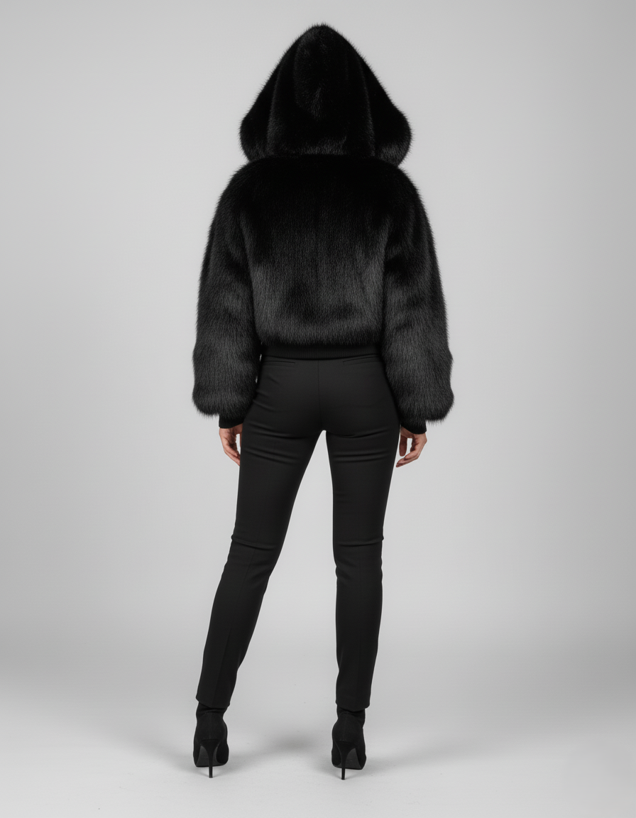 Ecopelliccia corta manica a pallocino con zip centrale, elastico in vita e sui polsini. con cappuccio. tessuto elasticizzato, vestibilità regolare.