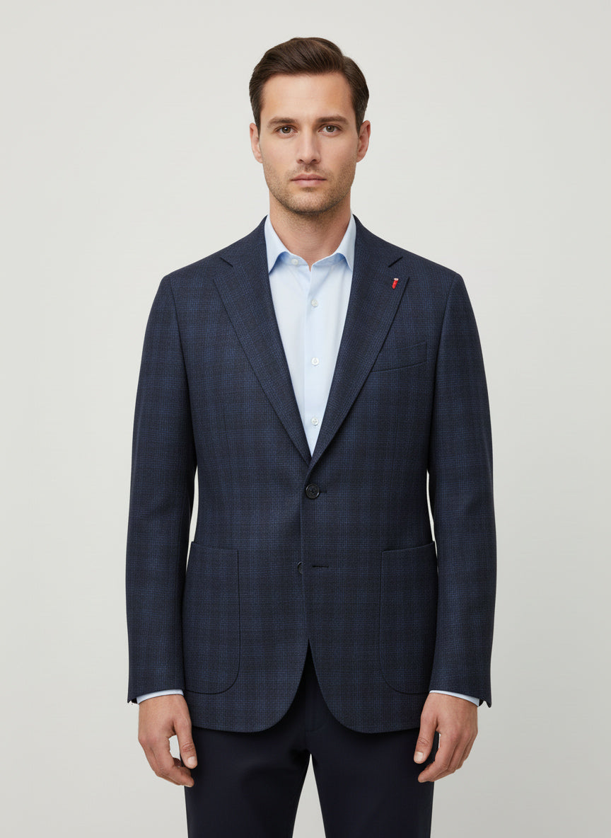 Giacca uomo Mulish modello a quadri realizzata in misto lana con spilletta, tasche a patta. Vestibilità slim fit. Il modello indossa la taglia 48 ed è alto 185 cm