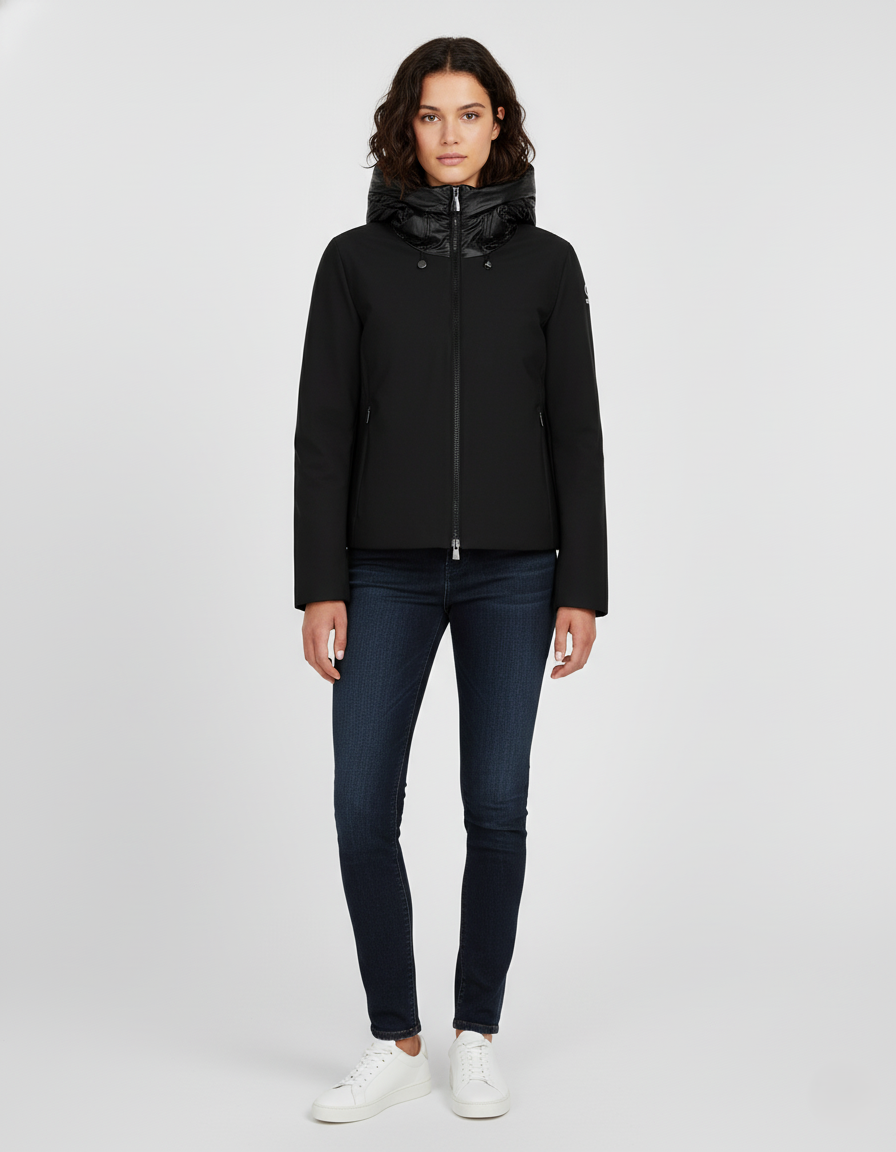 Giubbotto da donna COD. GBS53017D BLACK SUNS dal design compatto e funzionale, ideale per affrontare la routine quotidiana con stile e praticità. L’interno trapuntato garantisce comfort termico senza appesantire la silhouette. Le due tasche frontali sono ampie e pratiche, arricchite da una Safe Pocket interna, pensata per custodire in sicurezza piccoli oggetti personali. Il cappuccio fisso con finitura laminata cattura la luce con riflessi distintivi, aggiungendo un tocco di originalità. Il tessuto esterno impermeabile, traspirante e anti-UV lo rende un alleato ideale per l’uso quotidiano in città.
