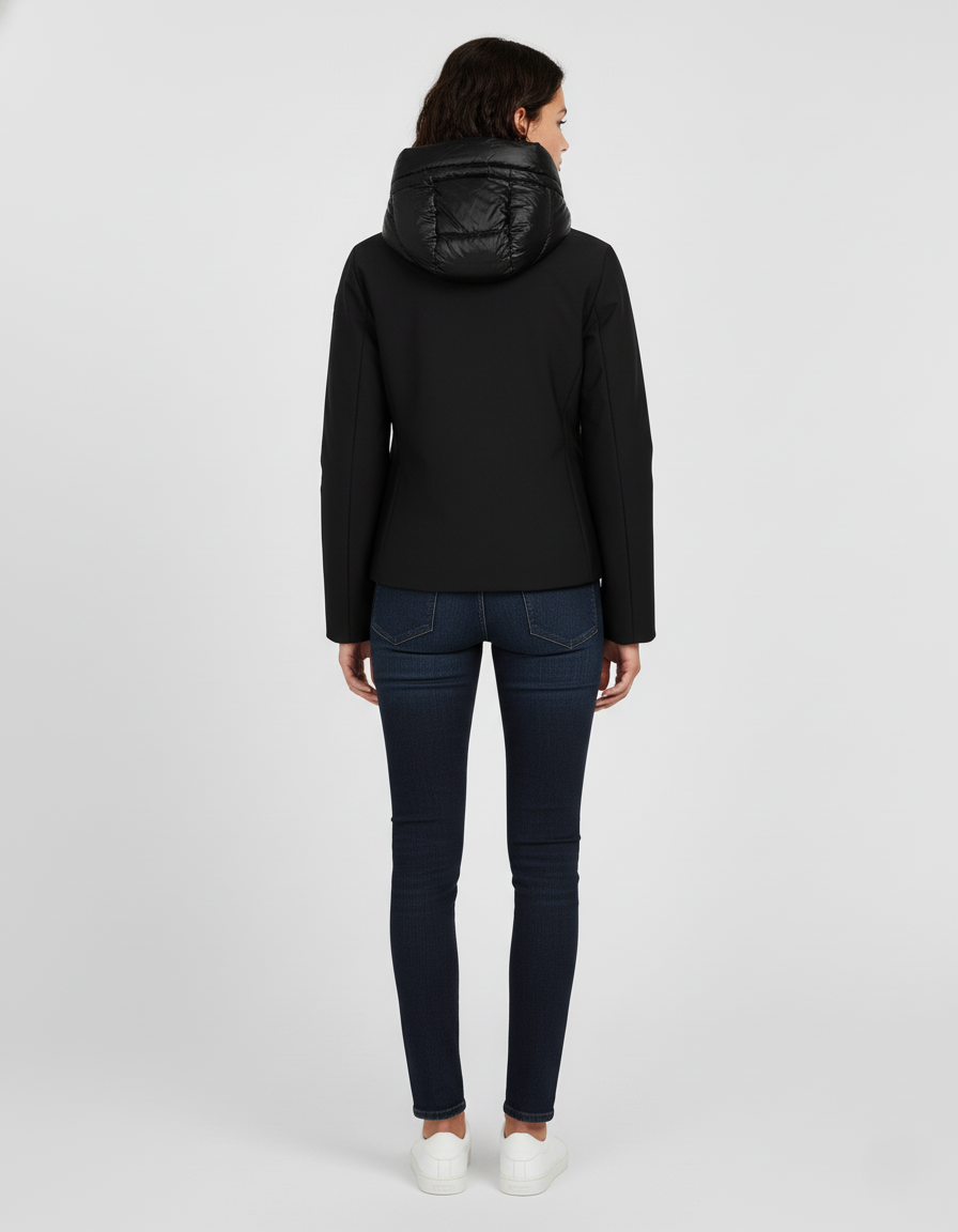 Cappuccio fisso con finitura laminata: look brillante e protettivo.