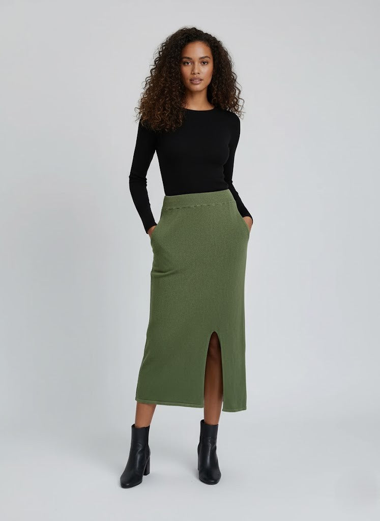 Gonna in maglia, spacco avanti, tessuto elasticizzato, elastico in vita, lunghezza media, taglia unica.