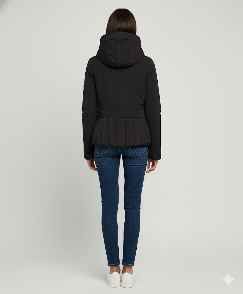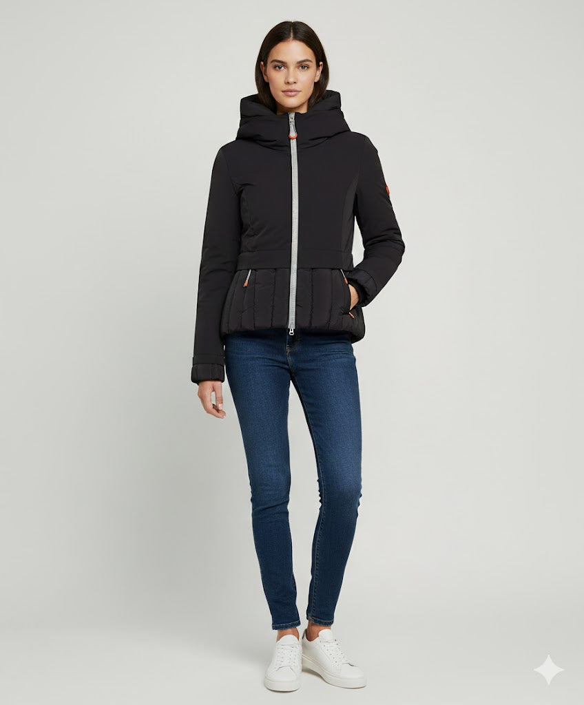 Piumino corto in doppio materiale: il tessuto principale è uno scuba tecnico in nylon stretch, dalla mano morbida e dall’aspetto opaco, leggermente mosso. Water repellent, disegna la parte superiore del capo cropped e dalle linee pulite. Il secondo tessuto, un nylon ultra leggero 20 denari dal peso di 40 grammi con trapunta geometrica a forma di piccoli lingotti. Anch’esso water repellent, emerge nella parte inferiore del capo evidenziando la silhouette femminile e creando un elegante gioco di volumi e un sofisticato contrasto materico. L’imbottitura in piuma sintetica garantisce calore e leggerezza. A completare il design, un’applicazione metallica a forma di oblò, dettaglio iconico del brand, tasche a filetto e avvolgente cappuccio. Un capo che mixa perfettamente femminilità e prestazione tecnica.